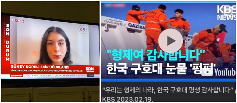 (Türkiye ve Kore’deki önemli haber kanalları, videomuzu ve Kore Afet Yardım Ekibi üyelerinin duygusal anlarını paylaştı. (Solda) 18 Şubat’ta TRT Haber Türkiye Devlet Kanalı. (Sağda) 19 Şubat’ta KBS Haber’in resmi YouTube kanalı.)